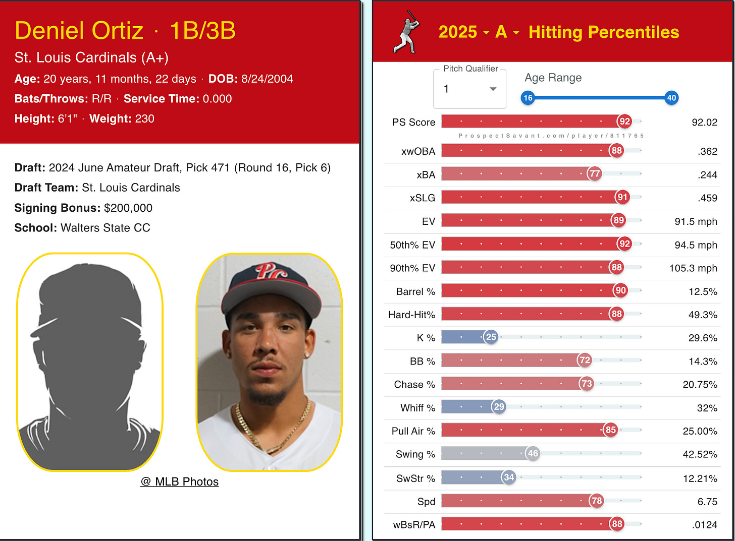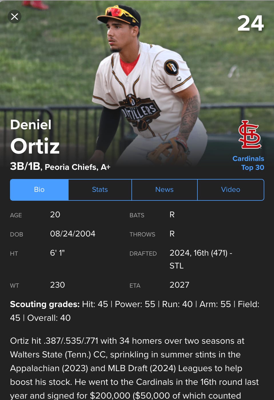 Ortiz now ranks as the Cardinals No. 24 prospect according to MLB. He’s graded out with plus power as well as a plus arm from the hot corner, with a below average hit tool, speed, and glove. The JUCO product now has been given an ETA to St. Louis of 2027.