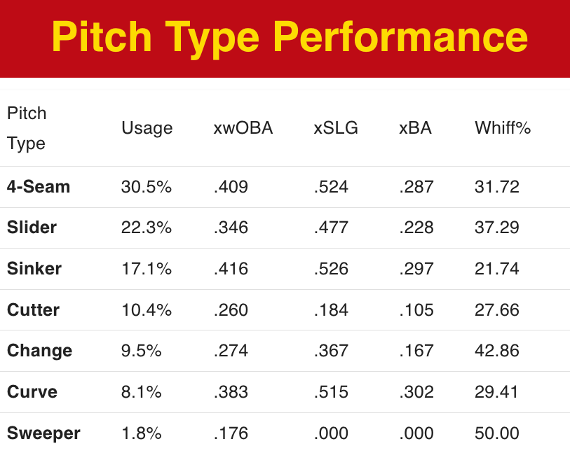 Sinker (17.1% Usage): .297 xBA | .526 xSLG | .416 xwOBA | 45.71% HH%
