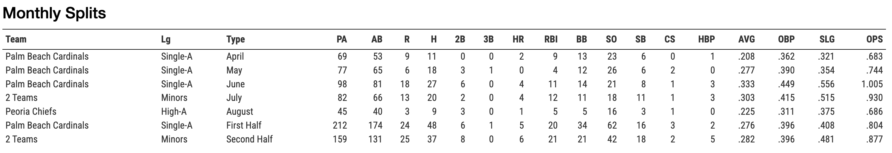 If he can maintain the power across the remaining levels of the minor leagues, he has a chance to be a 20/20 player at the big league level. A very large stretch but the 30+ stolen bases he has makes a ceiling of a 30/30 season impossible to get out of the mind.