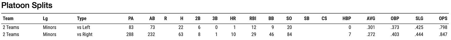 vs. LHP (83 PA): .301/.373/.425 | .798 OPS | 1 HR