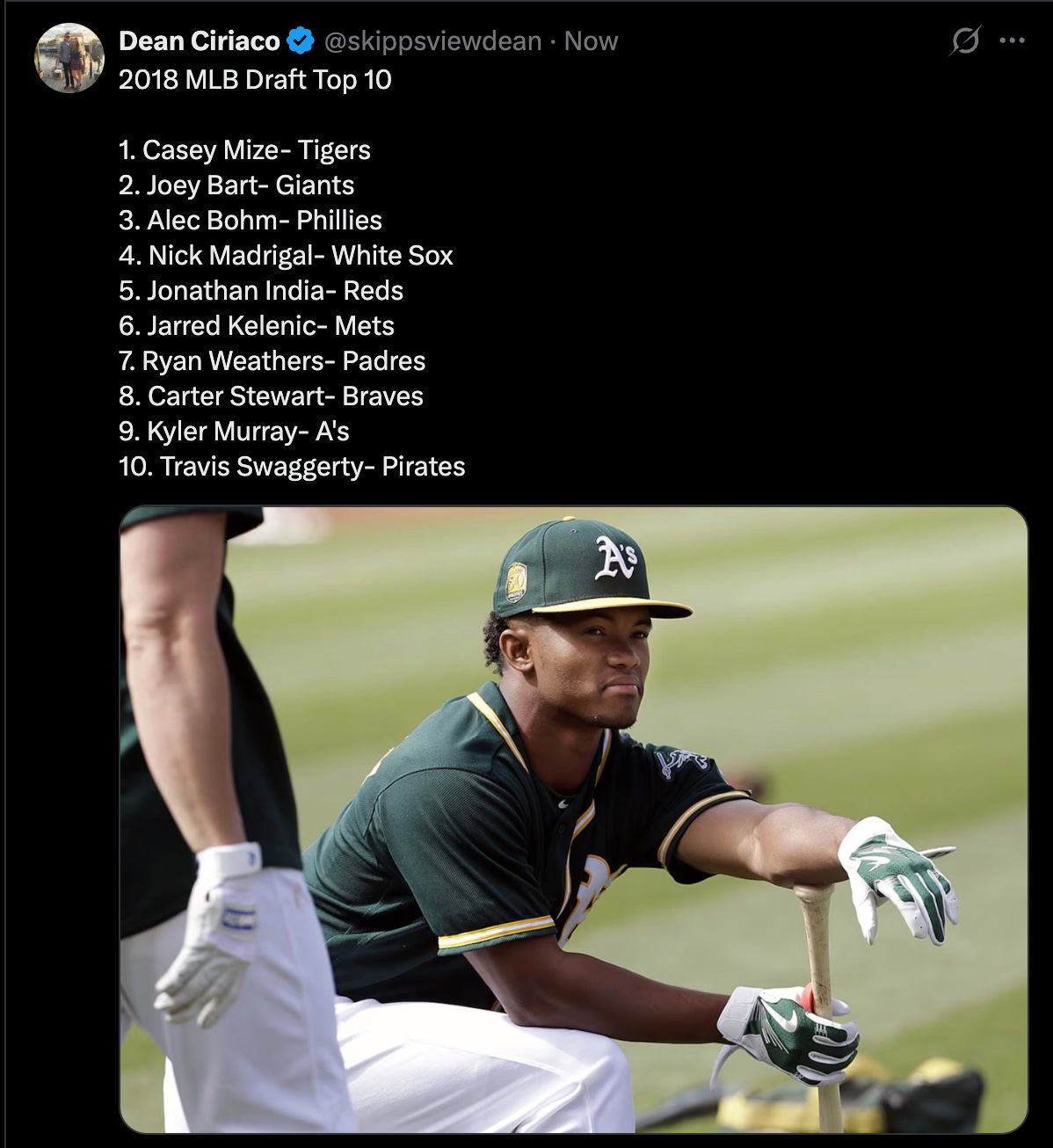 My favorite part of this draft is seeing Kyler Murray going to the Athletics. I think its time to have a serious conversation whether Murray made the right choice in terms of athletic success (he is rich).
