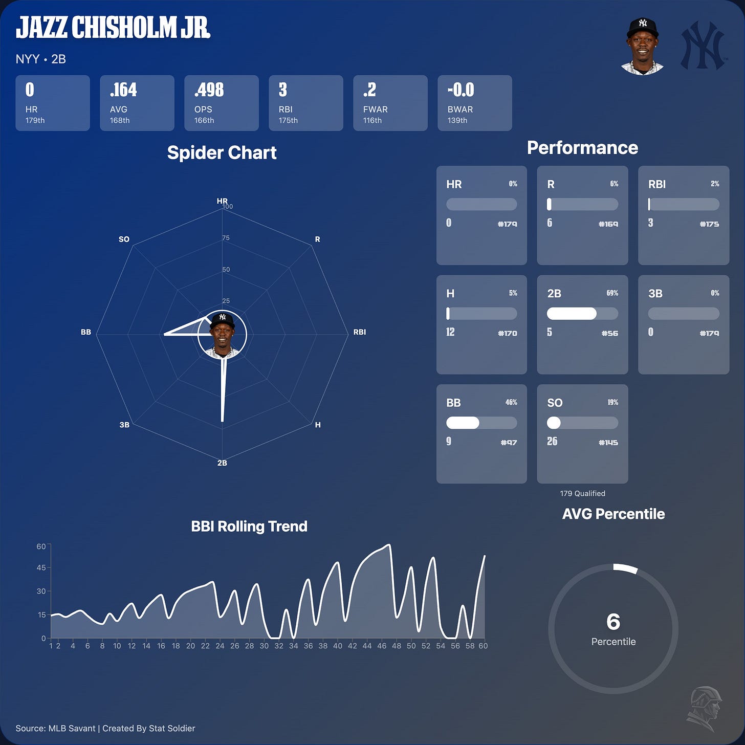 Jazz is almost 100 points in batting average below his career line. I am not overpanicking on Chisholm Jr. In his 176 games with the Yankees before the 2026 season, Jazz has racked up 42 HR, 103 RBI, .258 BA, and 49 stolen bases.