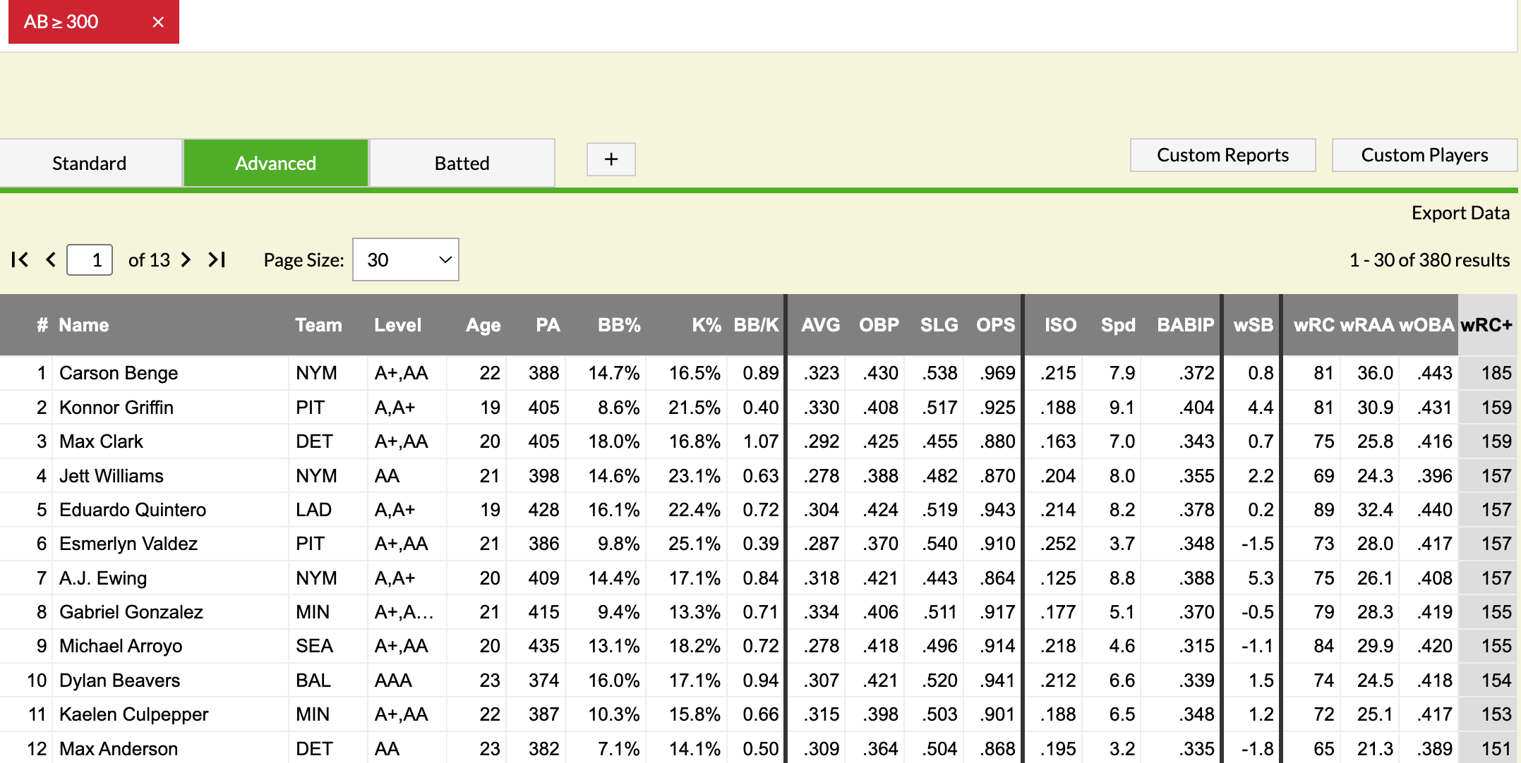 Now in 2025 he’s completely put together everything at the plate, adding some additional power to his plus hit tool. While ranked as the 98th best prospect on Baseball America and the 68th on MLBPipeline, let’s see how Benge stacks up against the best of minor league hitters.