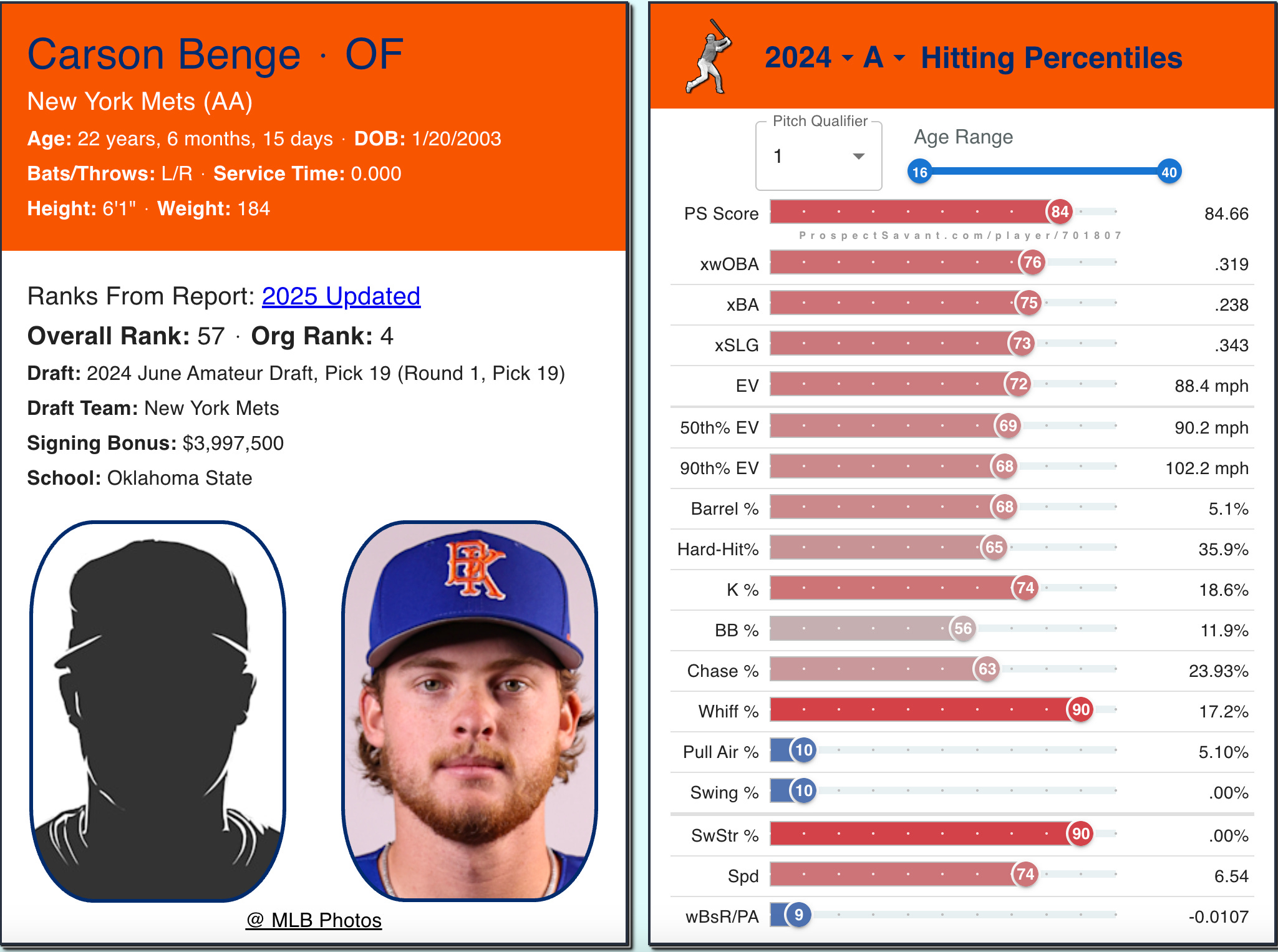 A little over a year ago, the New York Mets took Oklahoma State product Carson Benge with their 19th overall pick in the first round of the 2024 MLB Draft. Ranked as MLB Pipeline’s 18th best prospect in the 2024 draft, this was a solid get from the jump for the Mets as Benge was graded with plus-tools nearly across the board.