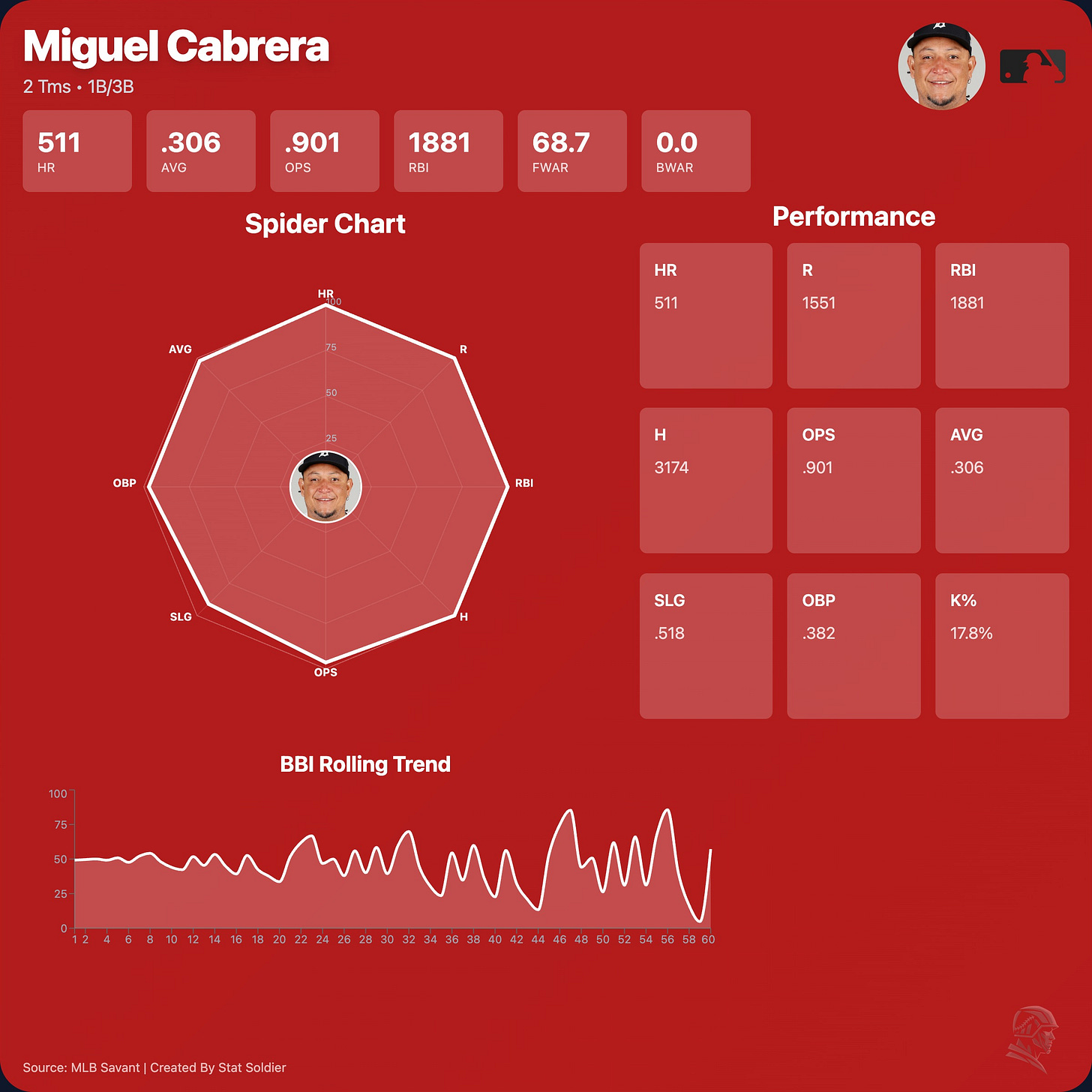 Accolades: 2 MVPs, Triple Crown (2012), 12x All-Star, 7x Silver Slugger, 1x World Series