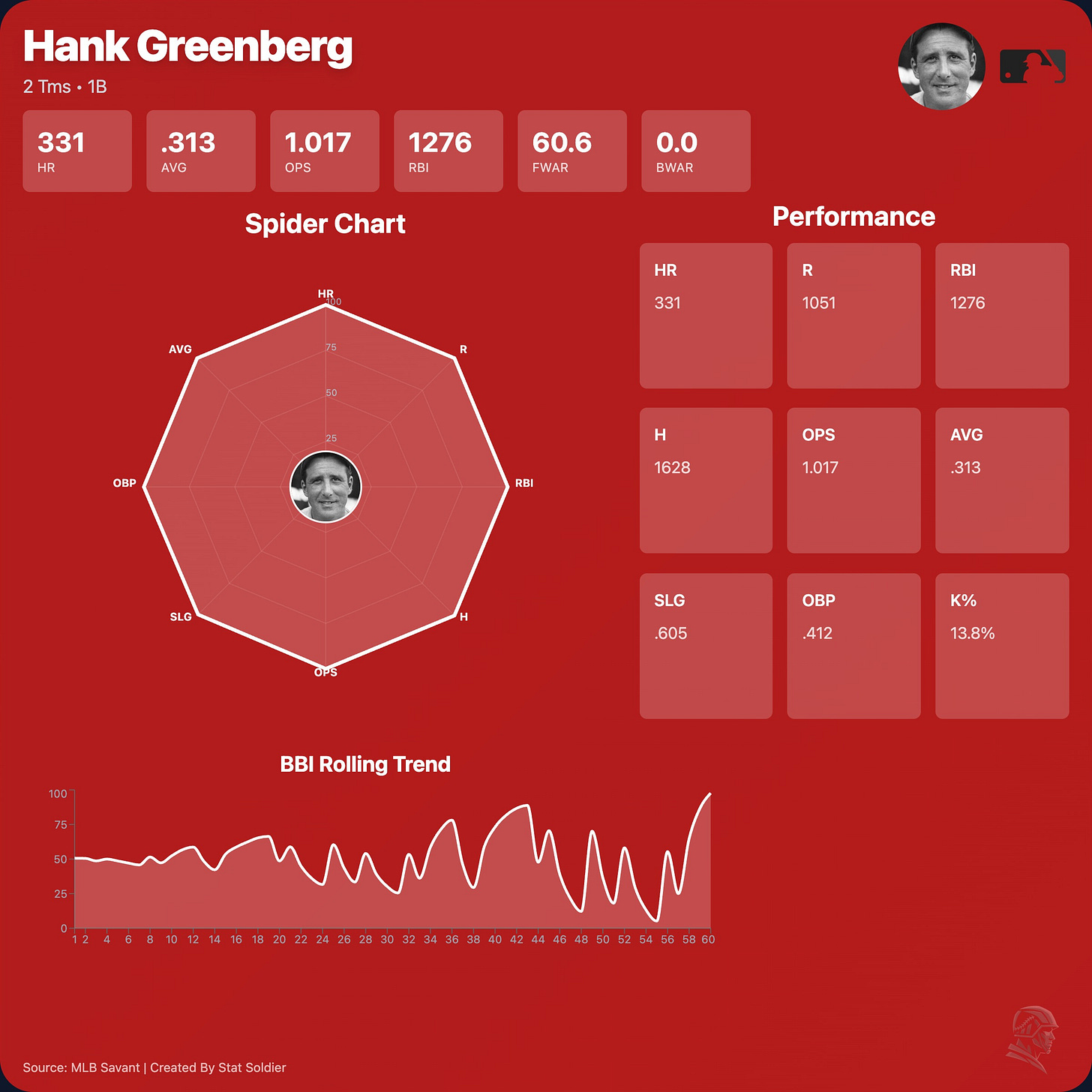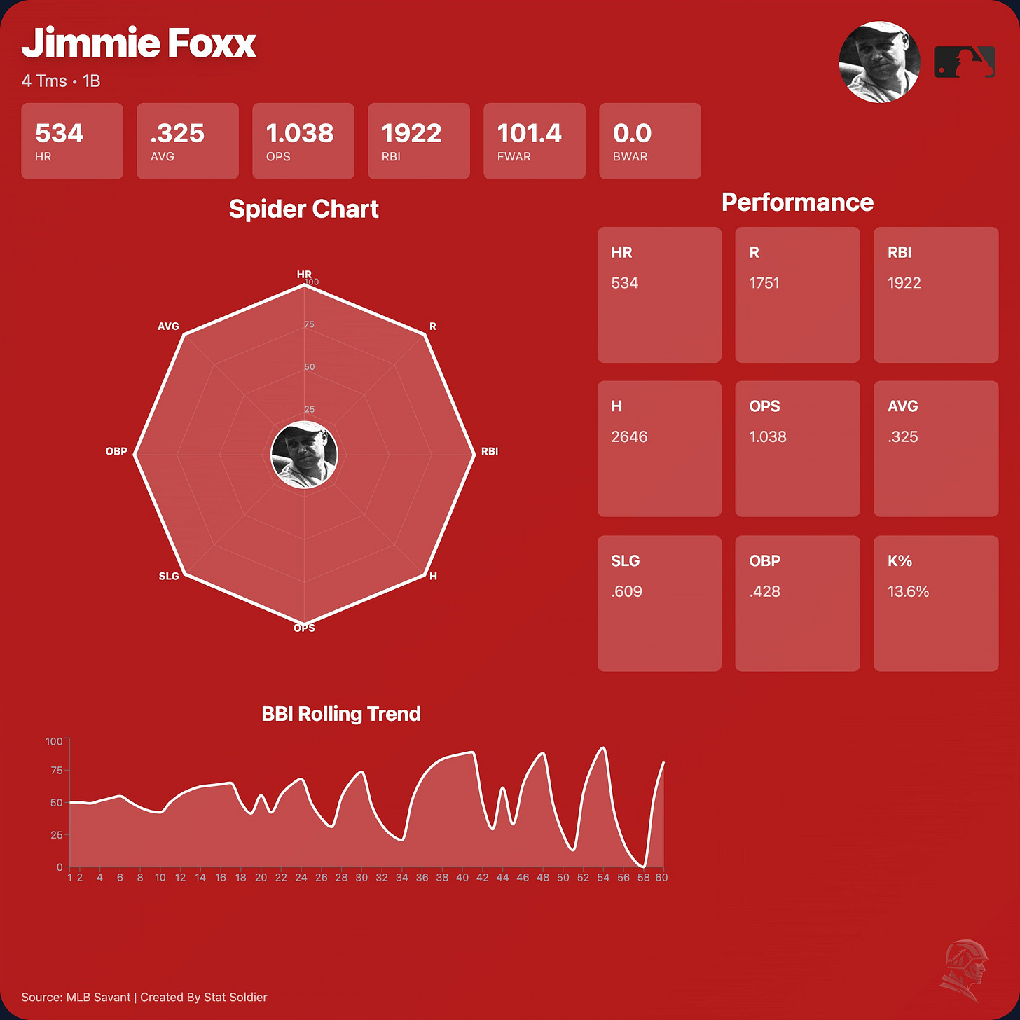 Why: Foxx was Gehrig’s greatest rival and perhaps the only one who could match his offensive prowess. What is super interesting about Foxx is that in the three years he won MVP, he also led in the league in WAR. While that might seem ordinary today, it was not common back in the day. If you follow our main account, you will see me breaking down WAR leaders by decade, and every decade, you see fewer and fewer MVPs. Foxx is the exception.