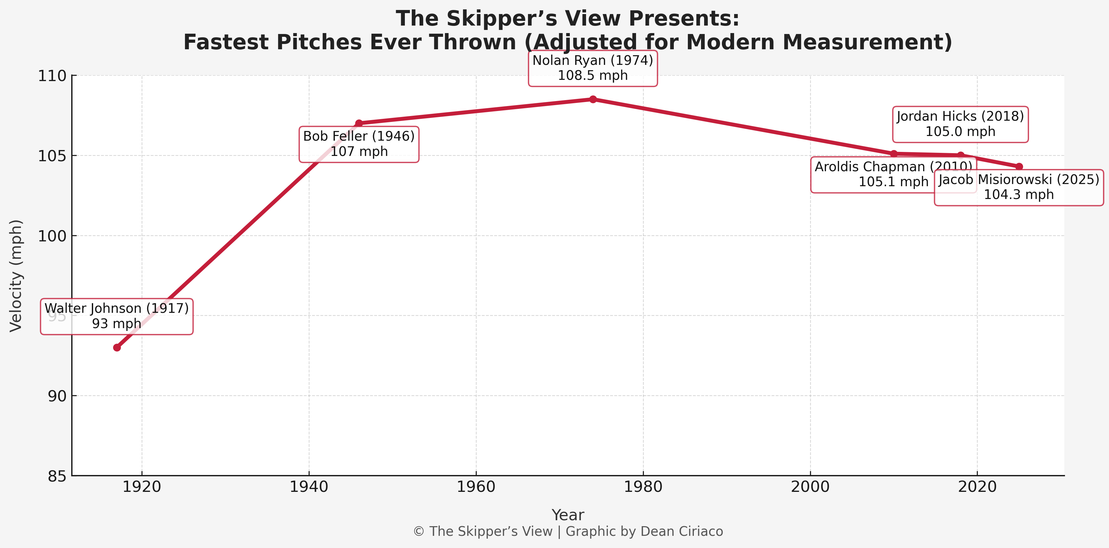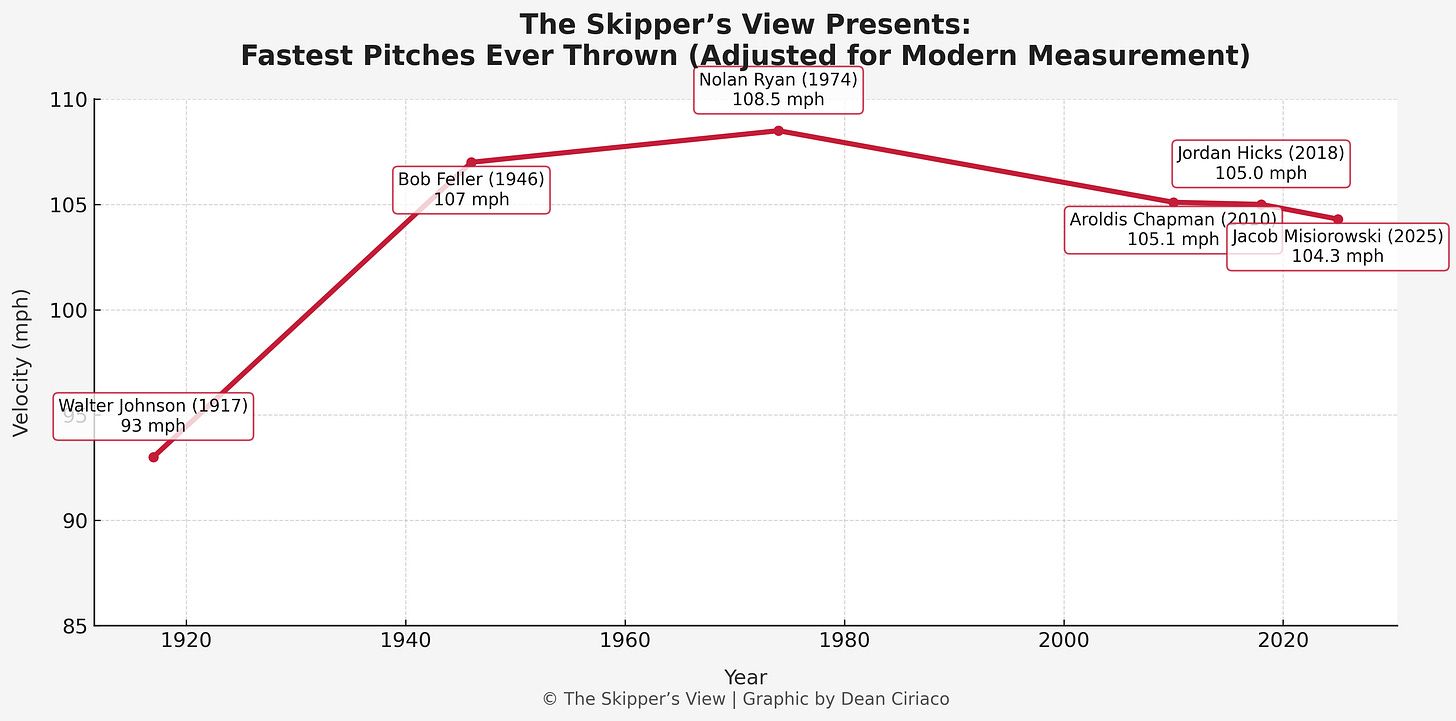 The crowd at American Family Field was still buzzing after last night’s game. Milwaukee Brewers rookie Jacob Misiorowski had just unleashed an awe-inspiring display of raw pitching power. The 23-year-old came out of the bullpen in the 3rd inning, throwing pure heat, repeatedly lighting up the radar gun at 102–104 mph. Misiorowski fired 31 of his 57 pitches at 100+ mph, including a pair that topped 104.2 mph. So, it made me think– How fast can a human being really throw a baseball?