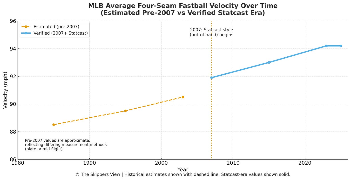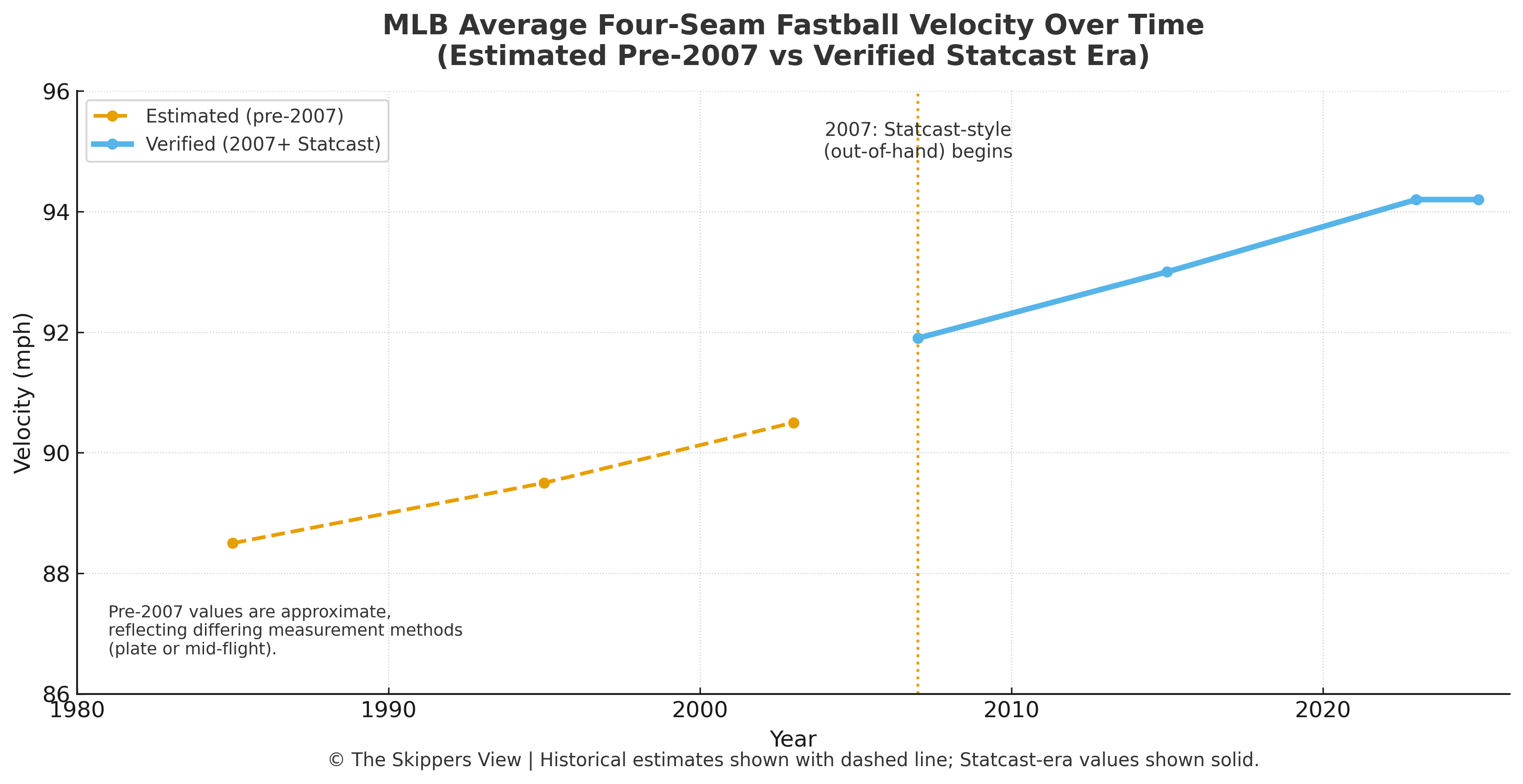 In 2002, the average MLB fastball sat around 89 mph. In 2025, it hovers near 94. Nearly every bullpen features at least one pitcher capable of touching 100 mph. The radar readings may be modern, but the race to the edge of human performance is timeless.