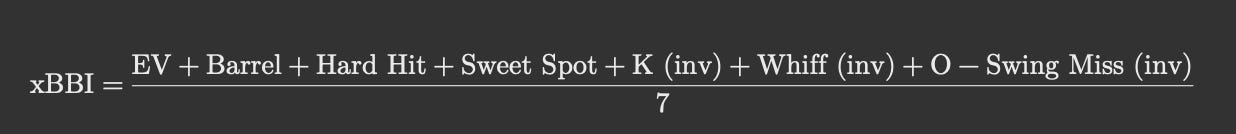 Below is the explanation as to what xBBI is and how it is calculated. Confused? Same. I worked with a coder to come up with the calculations and had Chat GPT and Bolt run it. Very soon, I will be debuting a website where you can see all qualified players and their BBI, ABBI, BBI+, and xBBI. Everything is scaled 0-10 for simplicity.