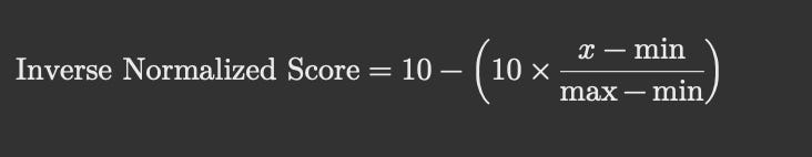 Each stat is min-max normalized onto a 0–10 scale, where: