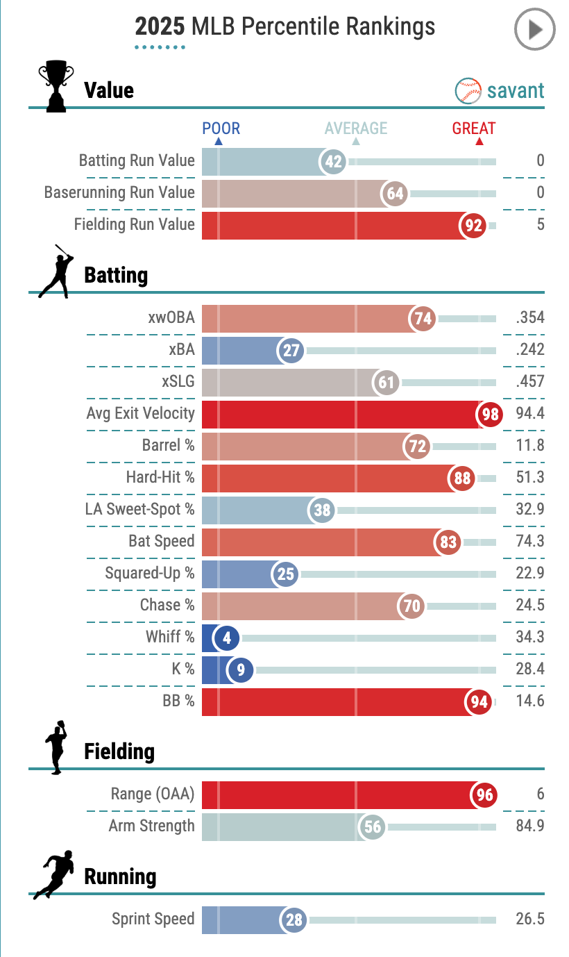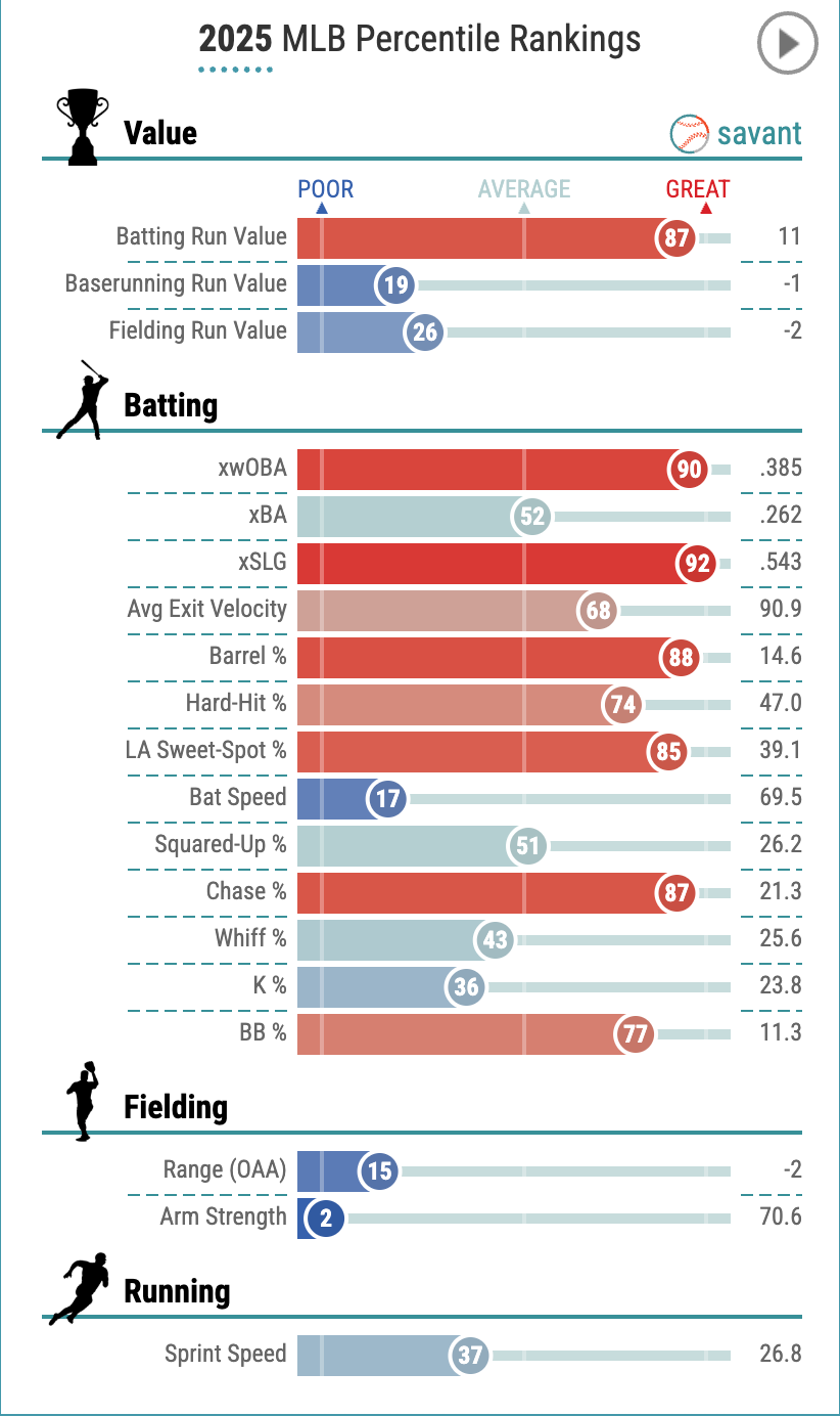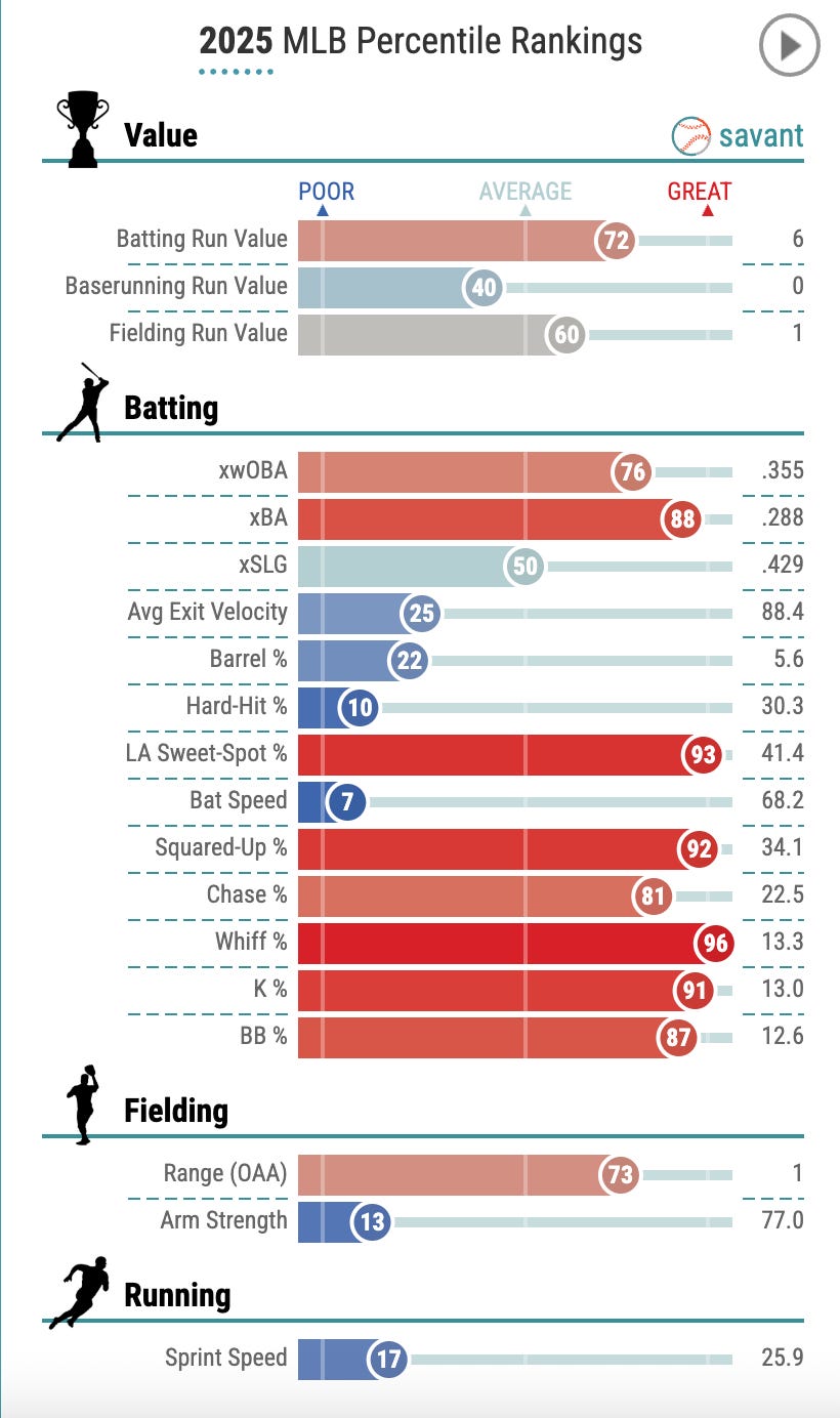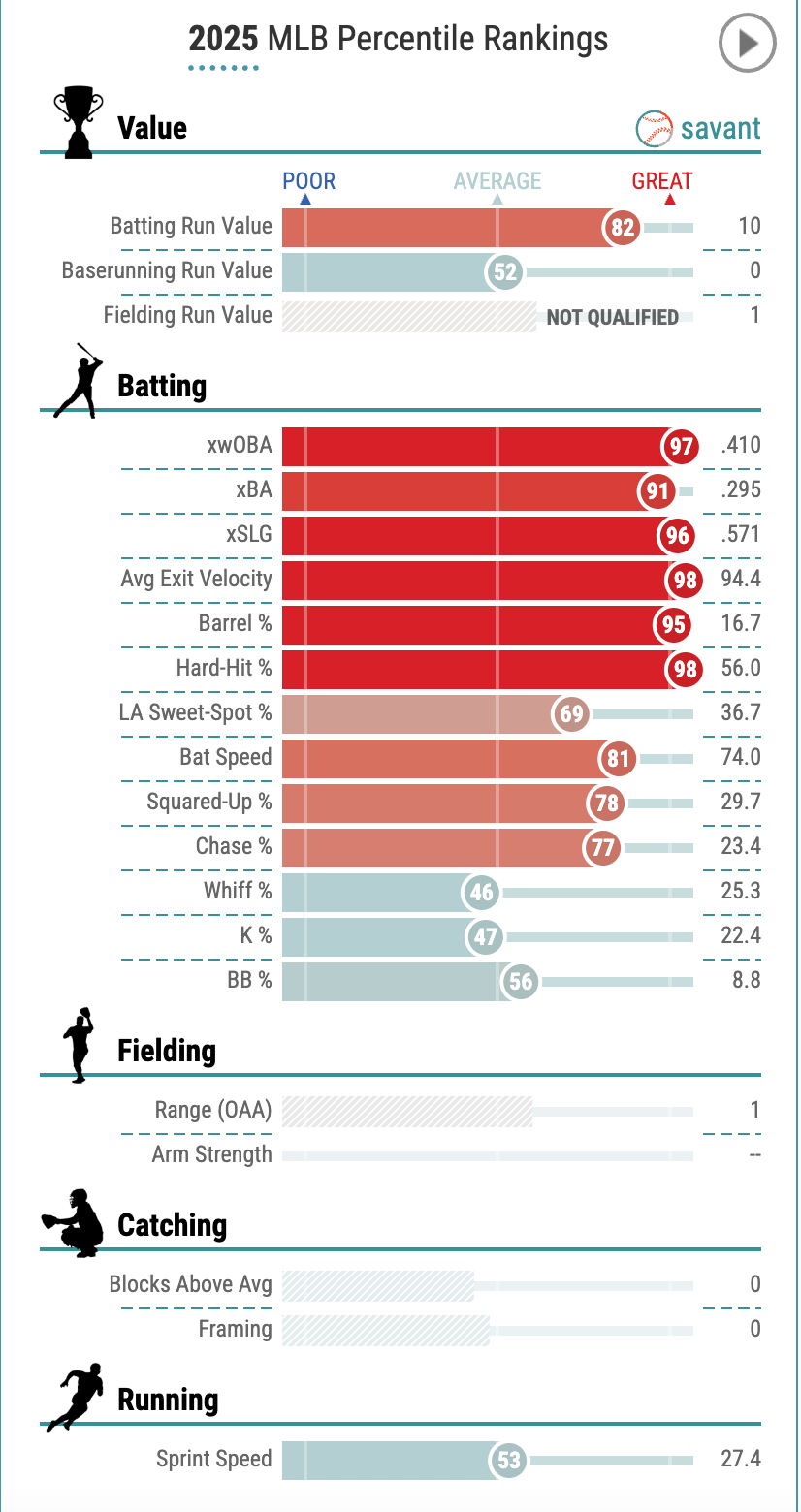 For years, Michael Busch had been one of the most highly anticipated prospects in the Dodgers’ entire farm system. Now, in 2025, his true potential is starting to be realized; unfortunately, he is doing so as a part of the Chicago Cubs, not the Los Angeles Dodgers. Busch is in his second full MLB season and is thriving on offense. His Batting Run Value of 11 ranks him among the top 87th percentile of MLB hitters. Additionally, his xwOBA and xSLG both rank in the top 90th percentile. While Busch might be one of the worst fielding first basemen in the league, his hitting prowess has more than made up for his defensive shortcomings, as he has proven himself to be one of the best hitting first basemen in the MLB.