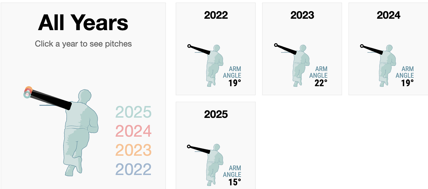 This success could be partly attributed to the change in his arm angle. In previous seasons, Lodolo’s arm angle in the past sat at either 19 or 22 degrees. Now in 2025, we’re seeing his arm angle at 15 degrees. Here’s a diagram look at the angle over the years.