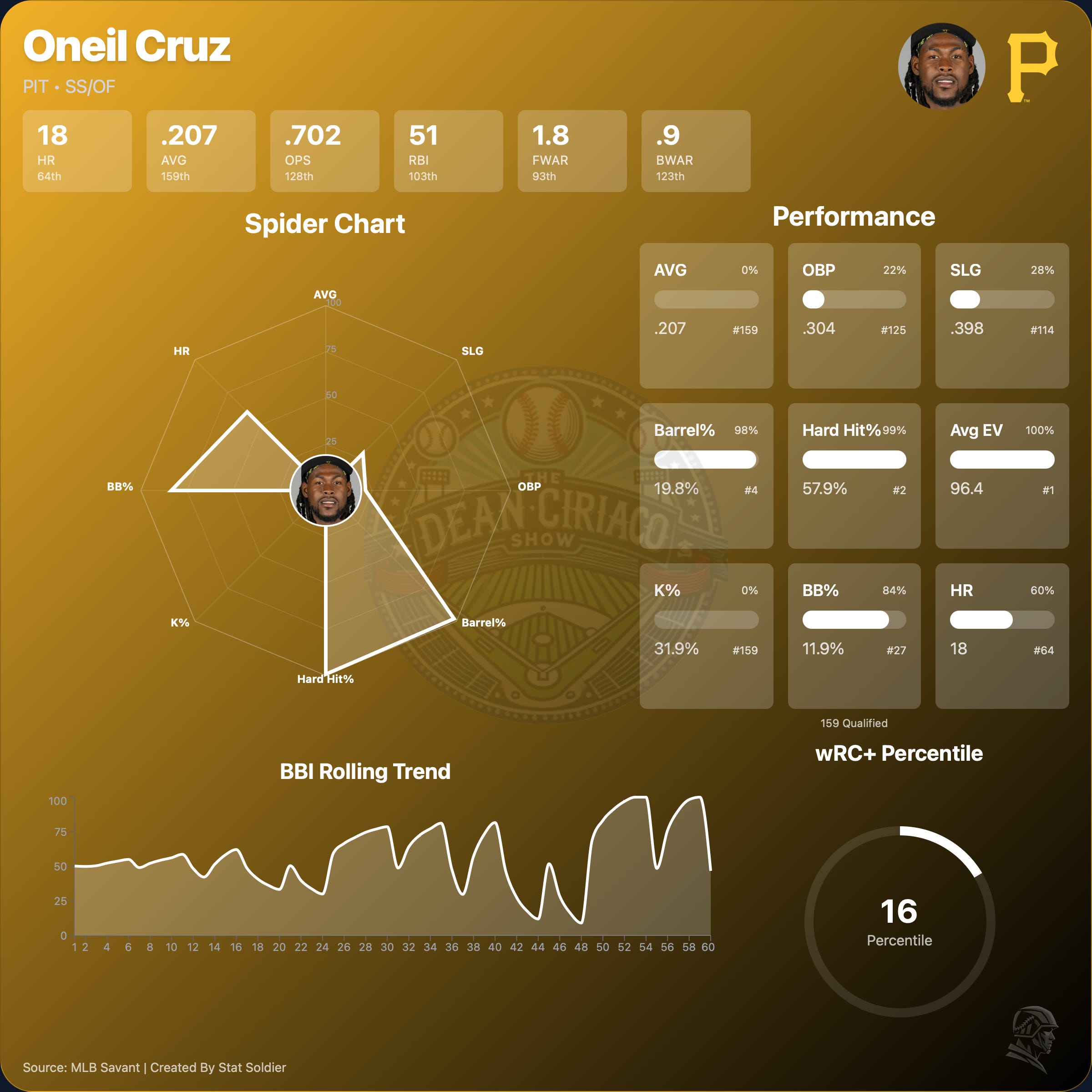Oneil Cruz’s raw numbers don’t scream superstar status. His batting average sits at .207 in 2025. His on-base percentage is a modest .304. Even his slugging, bolstered by elite power, hovers at .398. Strip away the tools and highlight reels, and his OPS of .702 doesn’t exactly shout franchise cornerstone.