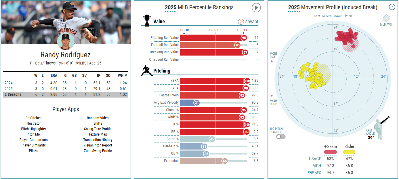 This didn’t stop the Giants from calling him up during the 2024 season, and he performed better than most expected: A 4.30 ERA might not look special on the surface, but the underlying metrics were great. Rodriguez ranked above-average in Chase%, Whiff% and K%, limited his BB% to 8.1% and his elite slider returned a 38.9% Whiff%.
