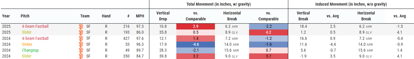His slider has been revamped too. He added around 1.5 MPH, bringing it from 84 to 86 MPH on average, and changed it’s movement profile completely. His 2024 slider was straighter and had a lot of drop to it. That profile in itself had a lot of success to it, but the change in profile has improved it even more.