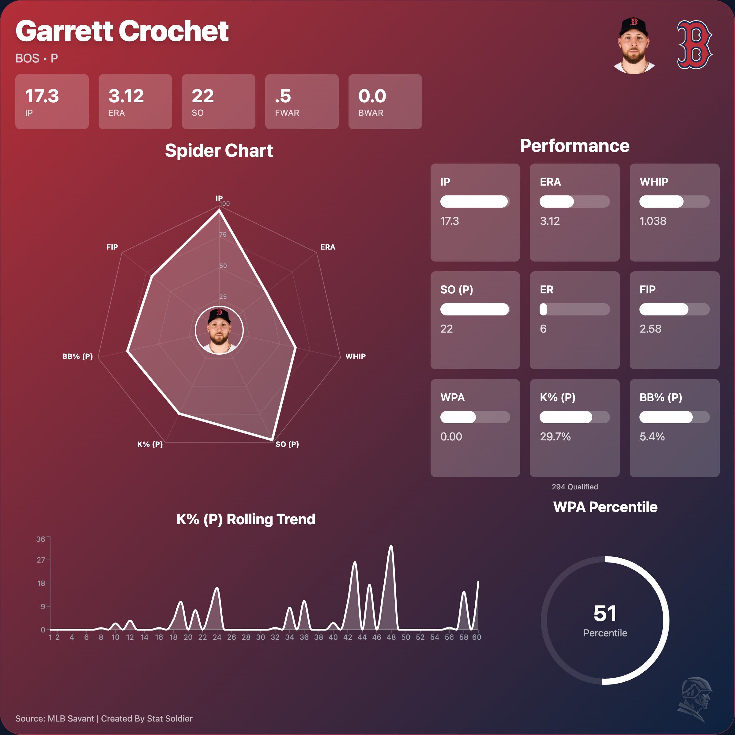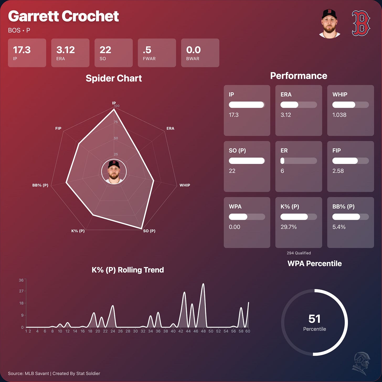 You know, I look at the graphic below, and while Crochet is not pitching at Cy Young levels right now, there is nothing sweeter than having a stopgap in the rotation. Tuesday’s game felt like a must-win for Boston. The panic and hysteria were beginning to settle in, and if Crochet faltered, the protesters were ready to storm the gate. Yeah, I walked away from the TV for five minutes, and he loaded up the bases, but the team won, so who cares?