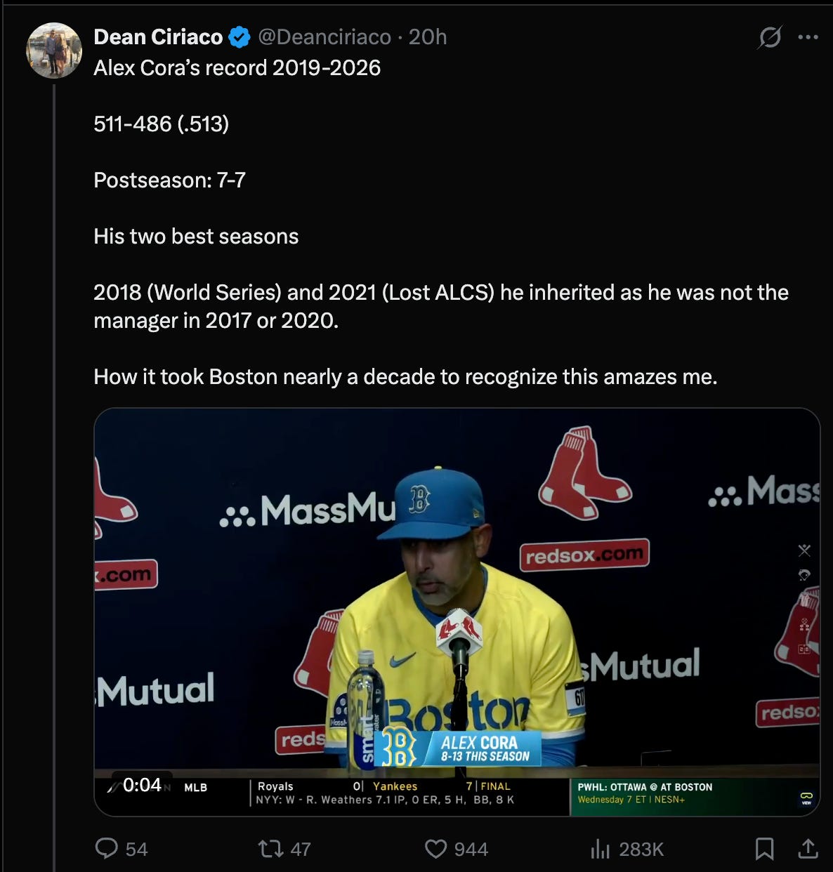 I have no idea how vile those comments are, as I ended up muting them. I stand by that tweet. Alex Cora was there for the 2018 championship, but how long of a rope do we give him because of that? It has been almost a decade of mediocrity with him at the forefront.
