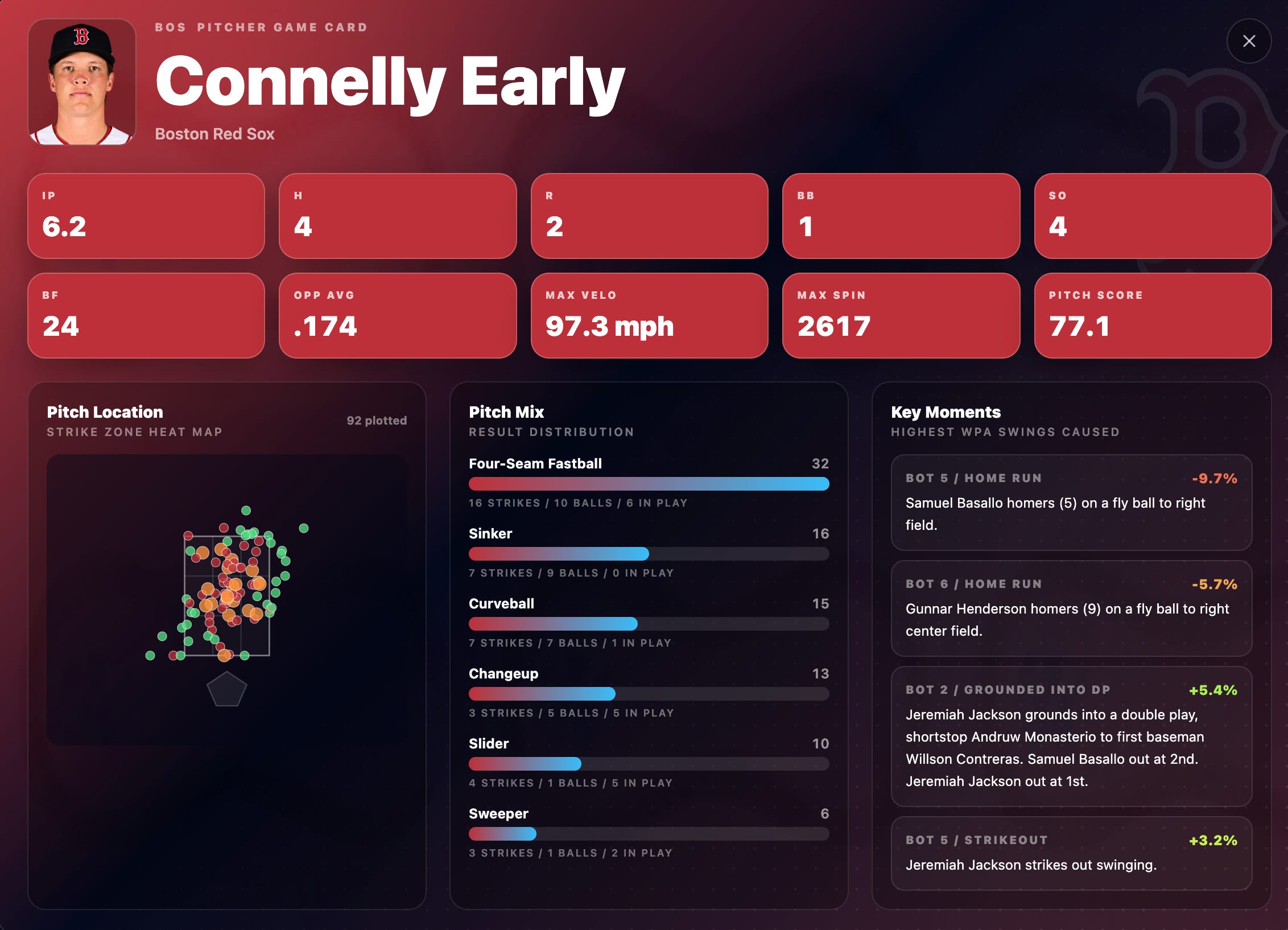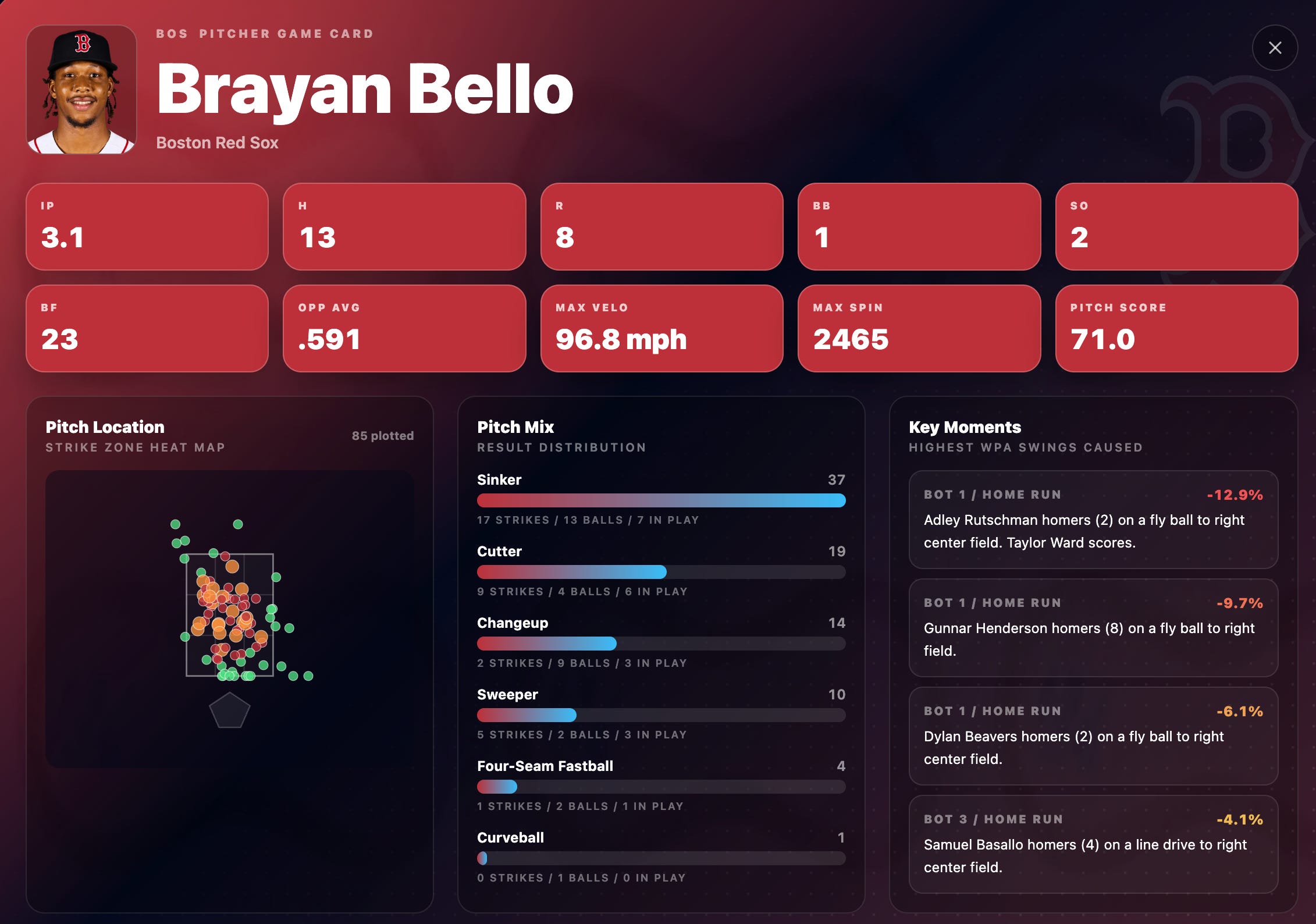 After his start, which you can see below in the new Stat Soldier game cards, Bello now has -1.0 bWAR for the season. This was probably the worst start of his career, giving up 13 hits and 5 home runs in just 3 1/3 innings.