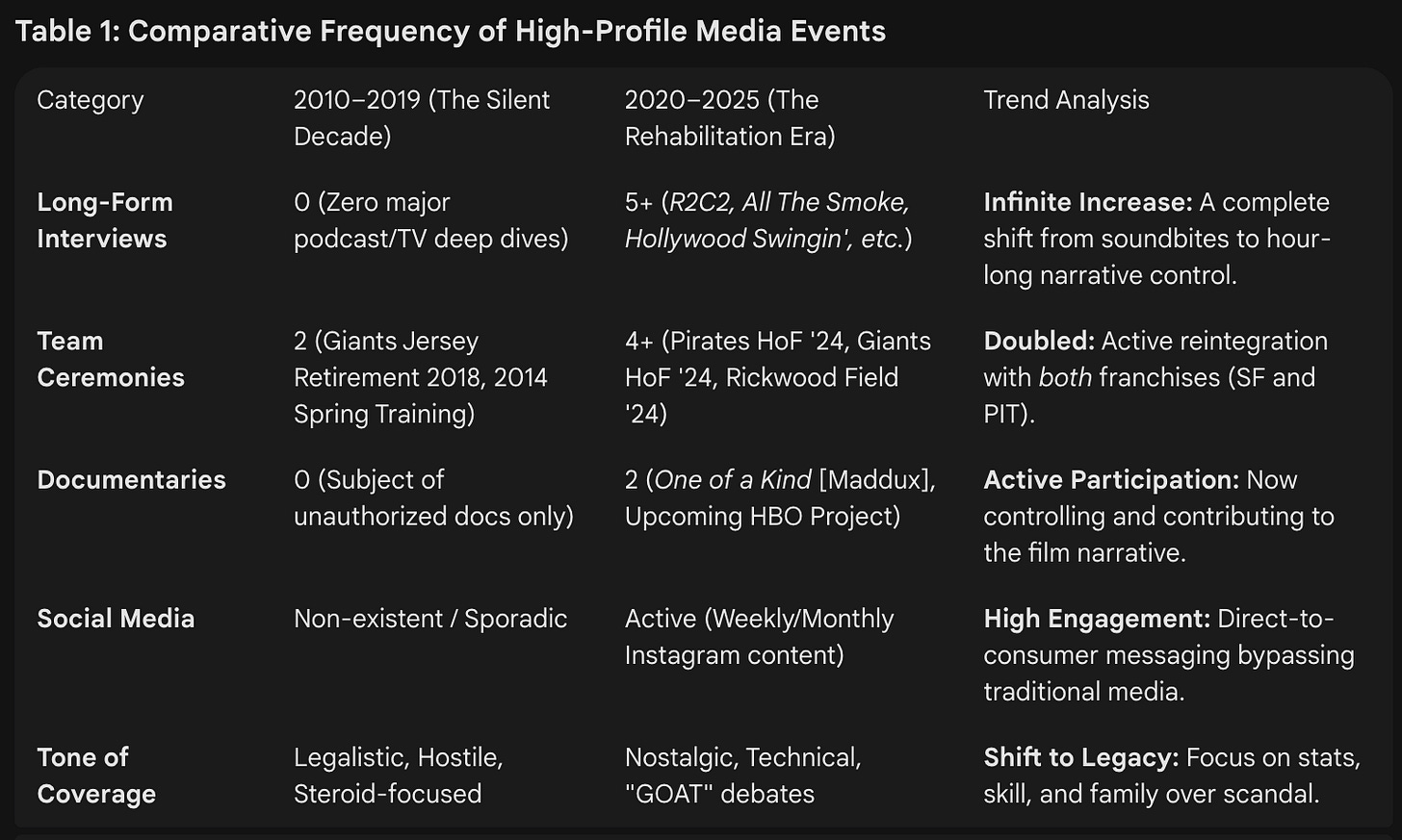 For the generation of new fans growing up, they are never going to see the cranky Bonds from his playing days. They know the guy on podcasts who, I will admit, is super passionate and articulate about how great baseball is. They see the man on social media posting photos with his dogs and grandkids. Bonds knows what he is doing. Just take a look at this chart.