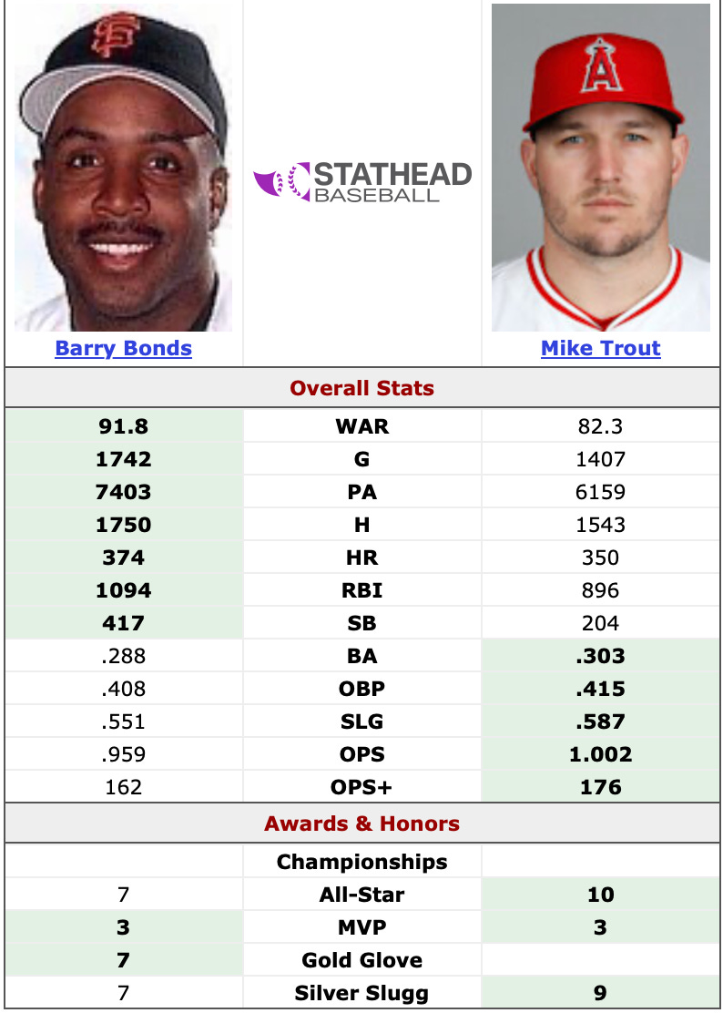 Do these numbers give “Greatest Player Ever” vibes? No, and that was the problem for Bonds; he wanted to be the greatest player of all time and could not deal with the fact that other players in the 90s were getting more attention than he was. Which is crazy, because he was like Mike Trout. A super dominant all-around player who was considered the best of his generation. Below are both players’ stats over their first twelve seasons.
