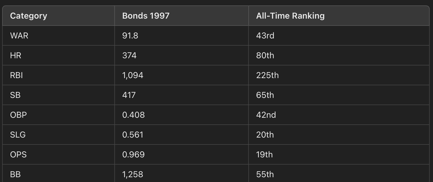 I used Stathead to see where Bonds would rank All-Time if he had retired after the 1997 season at age 32. Here they are.