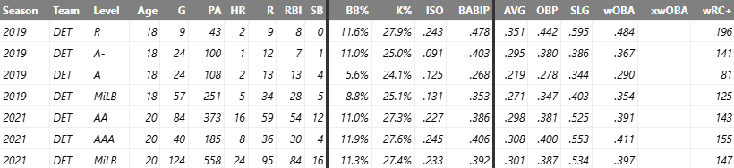 Riley Greene spent time in three levels of the Tigers organization in 2019 (Rookie, Low A, and High A). His stats: 251 PA, .271 AVG, .347 OBP, .403 SLG, 5 HR, 34 R, 28 RBI, 5 SB, 125 wRC+. An impressive showing for an 18 year old, so far living up to the high draft pick.