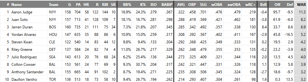 Greene is one of three hitters with >20 HR, >70 RBI, >140 wRC+, and >3.0 fWAR. The other two are AL MVP frontrunners, Aaron Judge and Cal Raleigh.