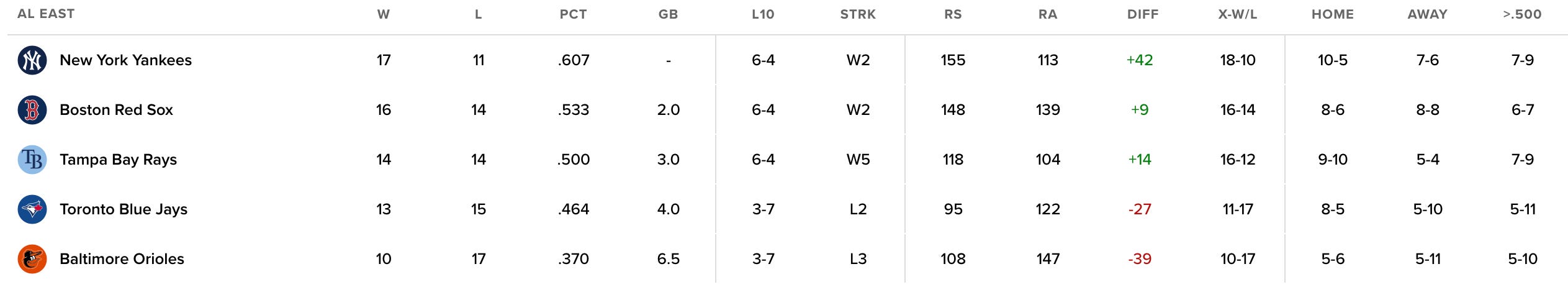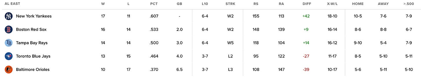 The Yankees still sit atop the American League East with a 17-11 record. One thing I noticed while reviewing the standings is that the Yanks have a winning record at home (10-5) and on the road (7-6) so far this season. They will need to keep this up if they plan to win the division in 2025. Especially considering they have a losing record (7-9) to teams that are above .500 on the year.