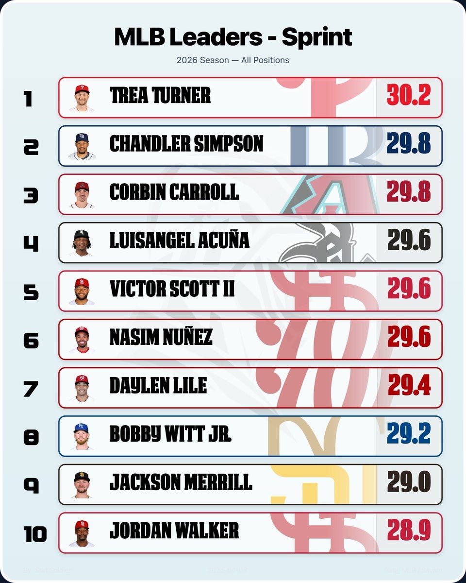 Also, after dropping roughly 7 pounds this offseason to focus on flexibility and explosiveness, his wheels have reached a new gear, according to the latest Statcast Sprint Speed Leaderboard. Dude is 6’6 250, and running as fast as Bobby Witt Jr.