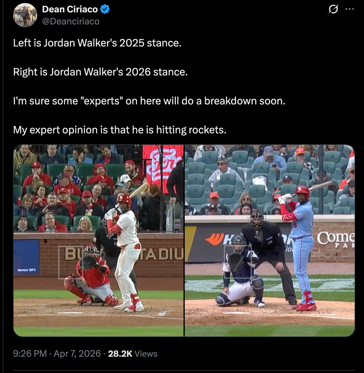 The above post is important to all of this because Walker made a significant adjustment to his stance. After struggling with a swing that had grown increasingly noisy and inconsistent, Walker and the Cardinals' hitting staff worked to strip away the "extra" movements that were causing him to get out of sync. By lowering his hand placement and keeping them closer to his body, he has significantly shortened his path to the ball. The most obvious change is his feet, which are closer together here in 2026.