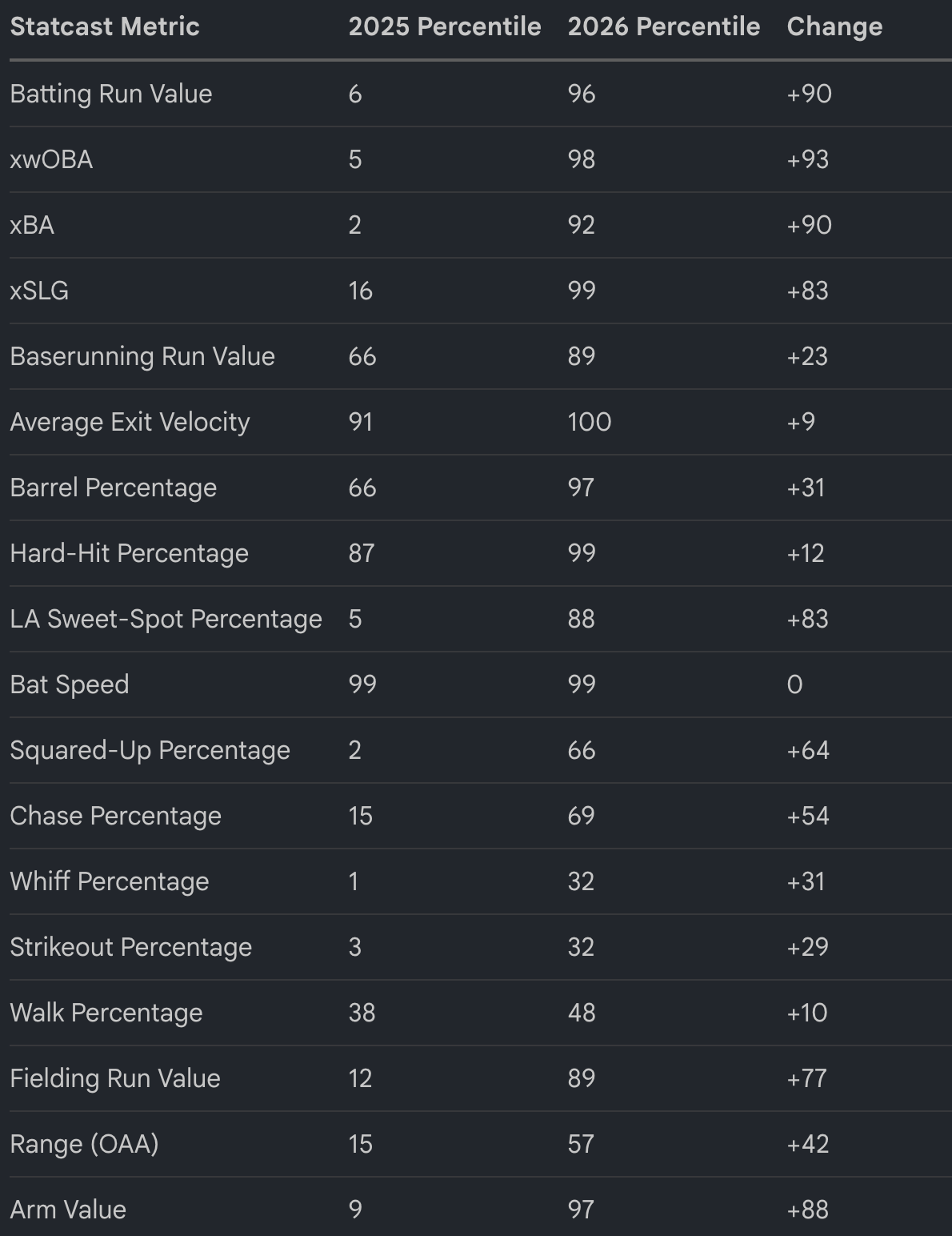 At least for now, these have led to significant changes in his Savant percentiles. Take a look at them below.