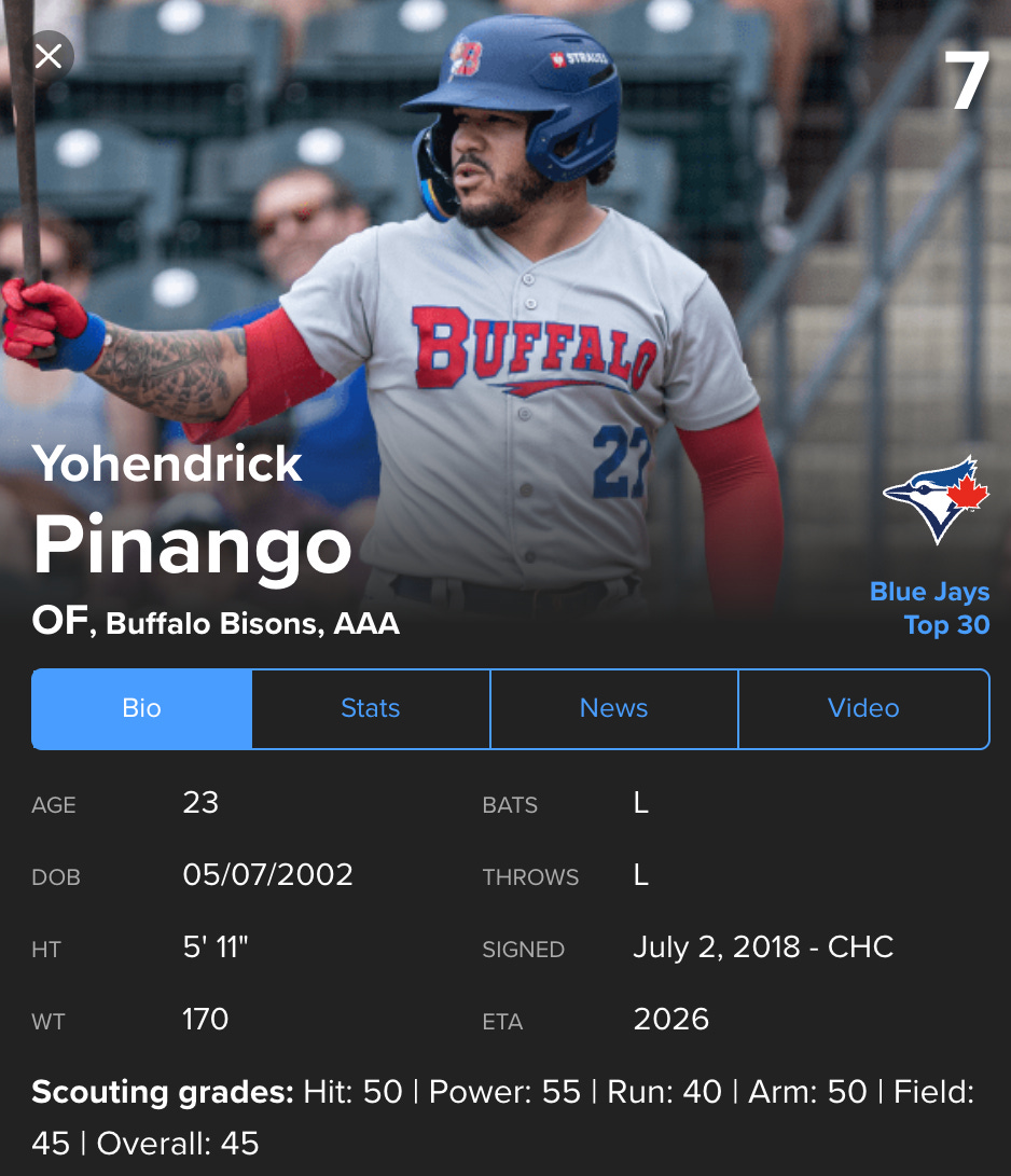 Yohendrick Pinango is one of the Blue Jays top ranked outfield prospects. A UDFA from Venezuela for $400,000, he was acquired from the Cubs a little over a year ago in the Nate Pearson deal. After a strong first half of the season in AA, Pinango now finds himself in AAA where he looks to take the final steps to become the next member of the big league club.