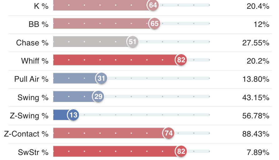 His plate discipline despite the jump in levels has remained rather consistent, with the BB and K% both taking slight dips. While his percentile rankings with the K & BB% are just above average, his numbers like Whiff% and SwStr% are much better.