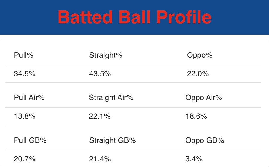 When we look at the batted ball profile, we see Pinango as a hitter who majority of the time takes the ball up the middle of the field. He does hit a good amount of fly balls, but with just a 13.8 Pull Air%, he’s not as able to capitalize on the fly ball contact. If he can start pulling the ball in the air more, we’ll see his HR total rise.